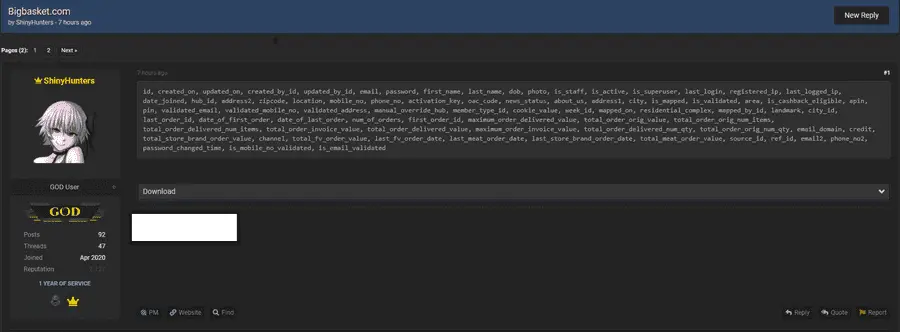 BigBasket, известный в Индии сервис по заказу и доставке товаров из гипермаркета, допустил крупнейшую учетку. Известнейший даркнет-деятель ShinyHunters, регулярно продающий информацию, полученную путём взлома, на этот раз выложил её бесплатно. 25 апреля он опубликовал базу данных пользователей BigBasket, в которой содержится не только их личная информация (история заказов, баланс, урезанные платёжные данные, ФИО, адреса доставок и т.п.), но также логины и хеши паролей.