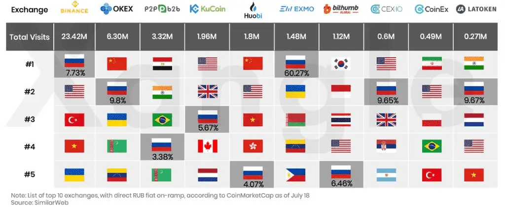 Кроме того, говорится, что «большая часть трафика на основные криптобиржи поступает из России». Статистика Xangle показывает, что Binance захватывает большую часть российского трафика, а за торговой платформой следуют Coinbase, Bithumb и Kraken соответственно.