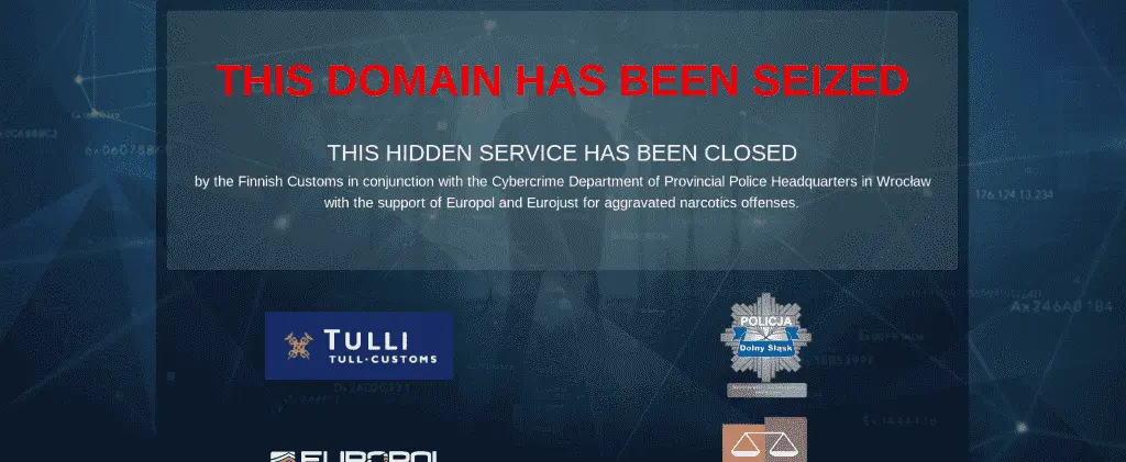 «Этот домен конфискован. Этот скрытый ресурс был закрыт таможней Финляндии совместно с Управлением по борьбе с киберпреступностью провинциального управления полиции во Вроцлаве при поддержке Европола и Евроюста в отношении преступлений, связанных с тяжкими нарушениями законов против наркотиков».