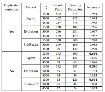 Эти результаты доказывают, что тот подход, который хорошо показал себя на форумах даркнета в предыдущих исследованиях, явно имеет ограничения при использовании на торговых площадках даркнета. Это происходит главным образом потому, что поставщики обычно используют одинаковые шаблоны для создания описания своих товаров.