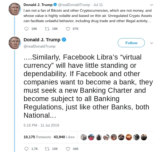 Более того, масло в огонь подливает действующий президент США Дональд Трамп. На днях он выразил свою позицию, относительно криптовалют и, в частности Libra, на своей странице в Twitter .