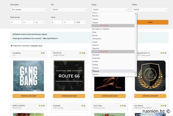 В интерфейсе площадки ничего нового – каталог магазинов и поисковик по товарам на главной. Юзер может выбрать между темной и светлой темой оформления сайта. Есть магазины из РФ, РБ, Украины, Тбилиси, Донецка, Луганска и Абхазии.