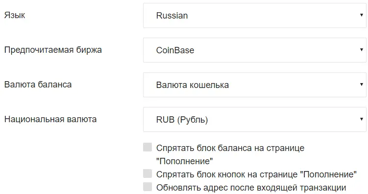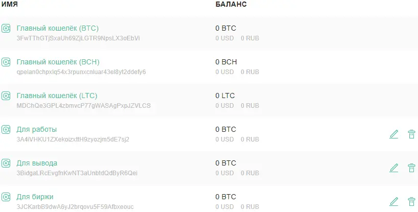 Здесь вы можете хранить BTC, BCH, ZEC, DASH, ETH, LTC. По одному адресу на каждую валюту, но можно создавать дополнительные адреса — и при желании получать на и отправлять с нового адреса хоть каждый раз; при этом адреса можно сохранять надолго и наименовывать, например "Для работы", "Для вывода", "Для биржи" и т.п.