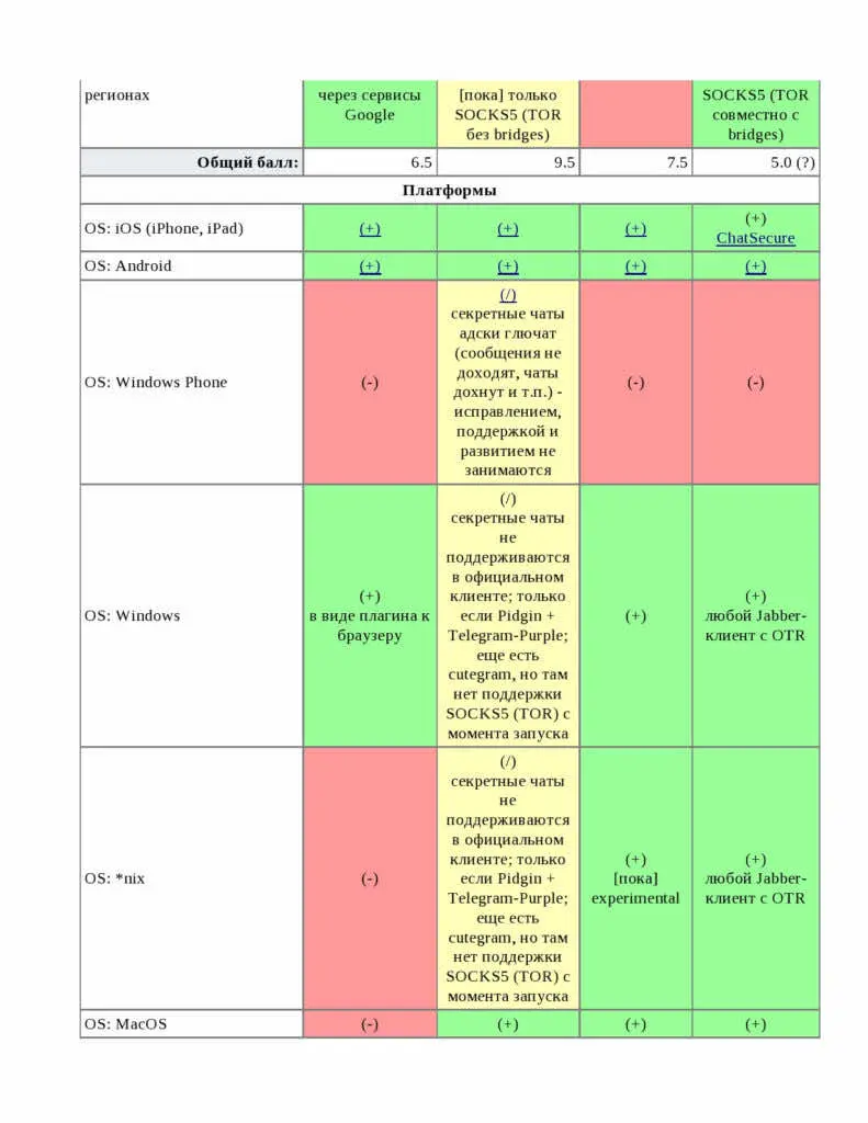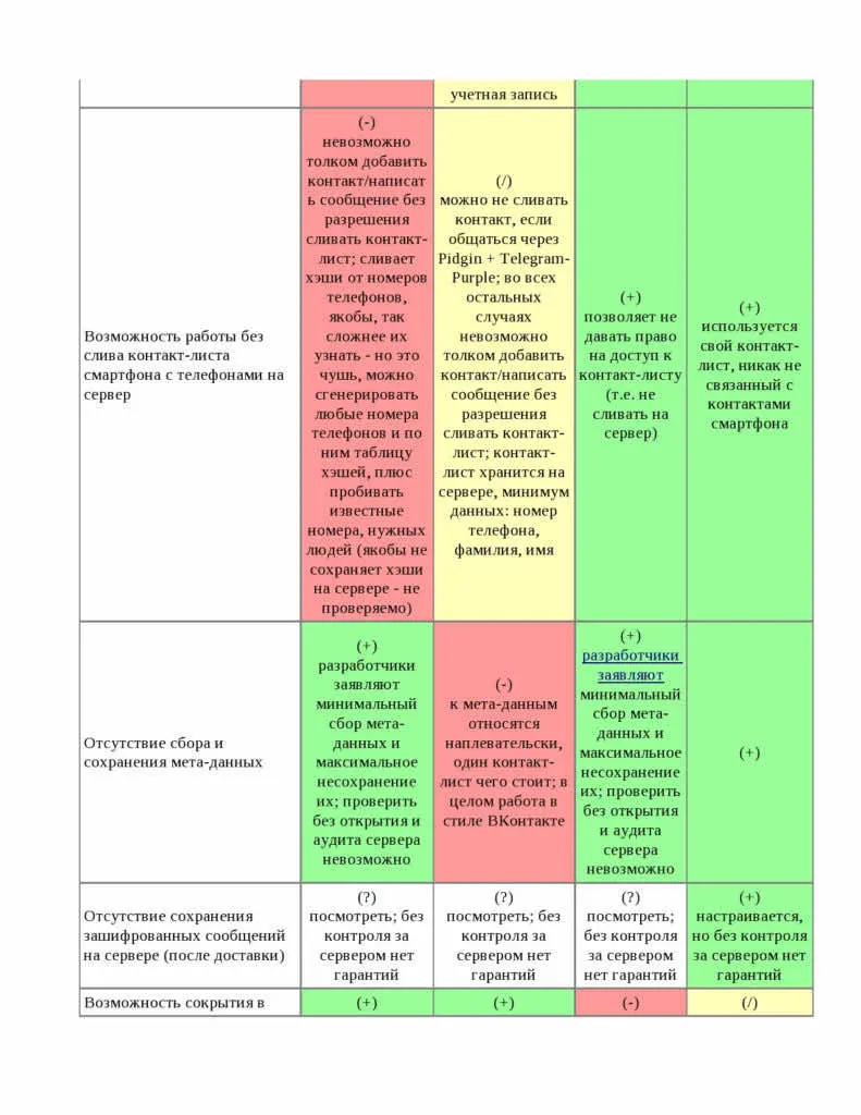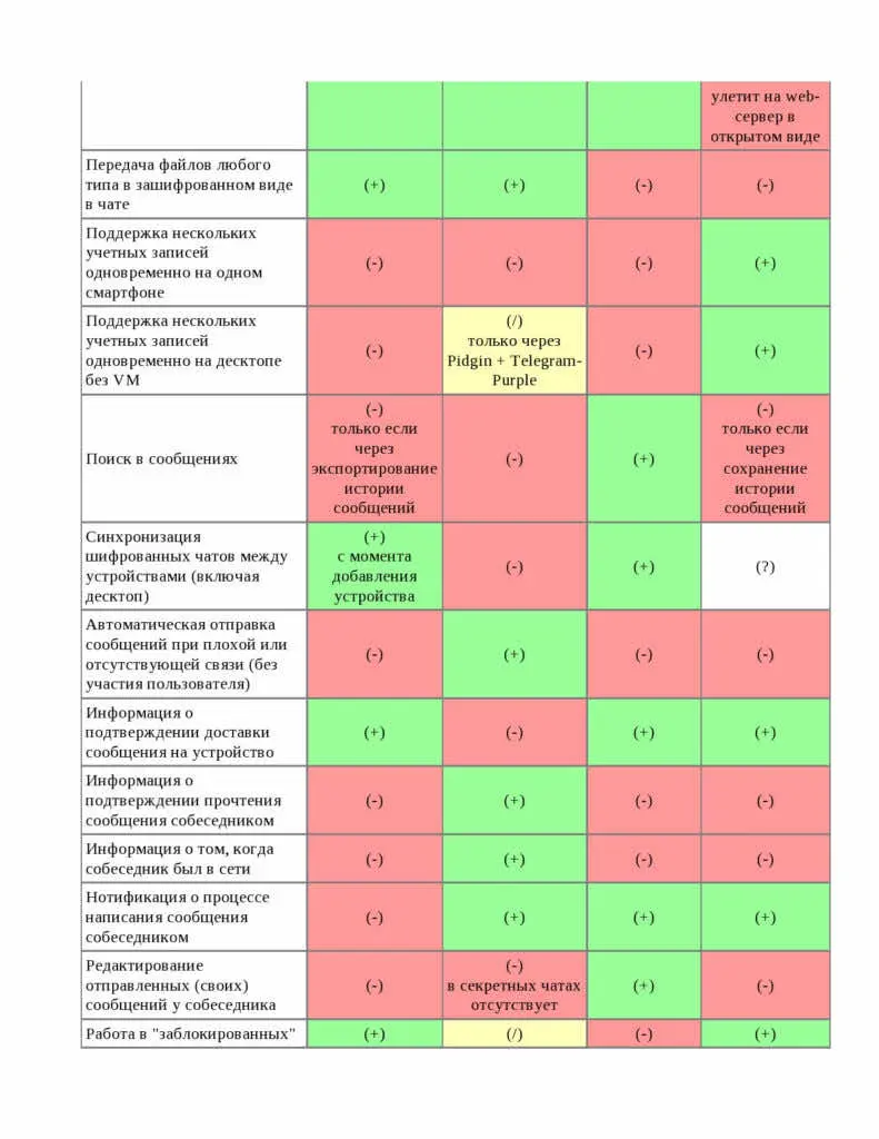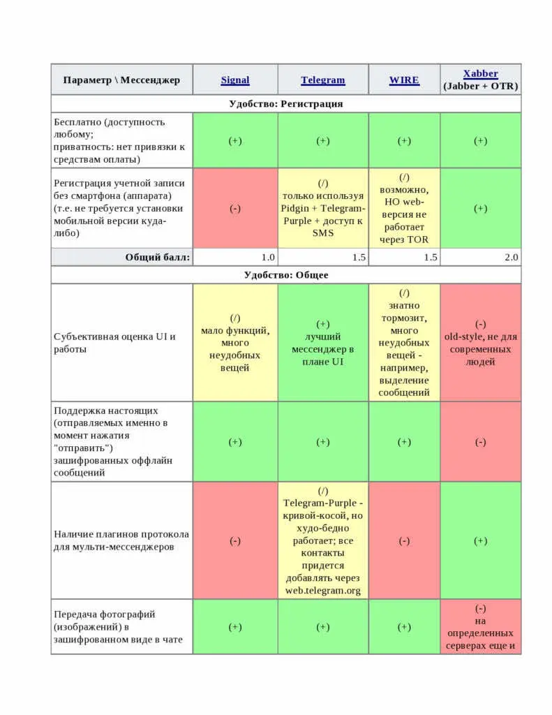 Ниже представлена таблица сравнения мессенджеров с функцией end-to-end шифрования относительно различных параметров, таких как удобство, доступность на различных платформах, анонимность и приватность и, собственно, реальная безопасность.