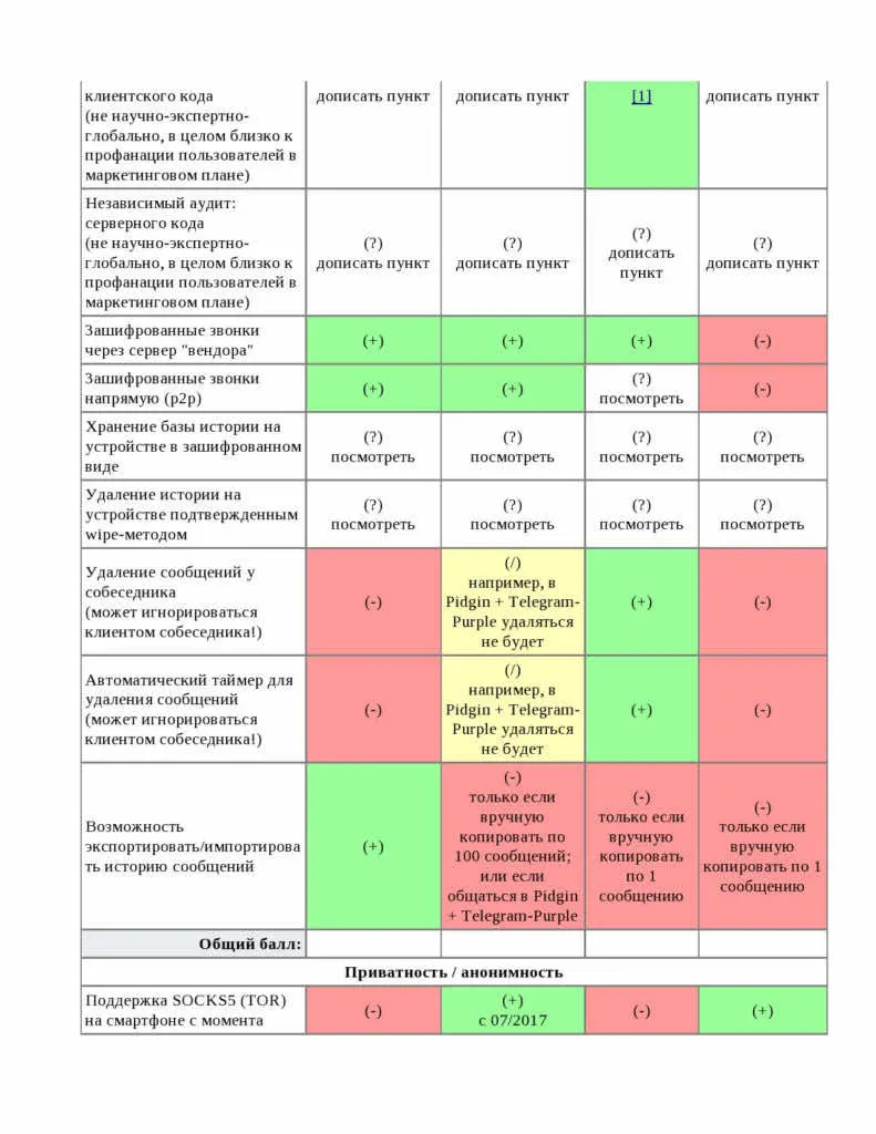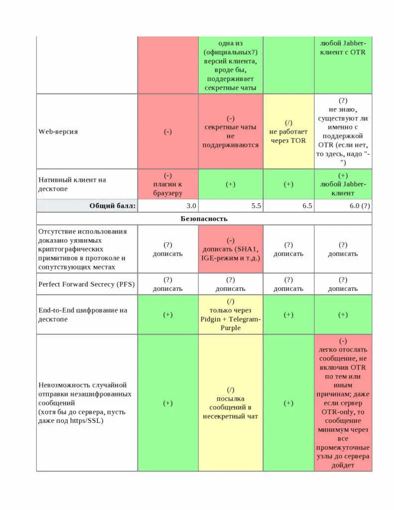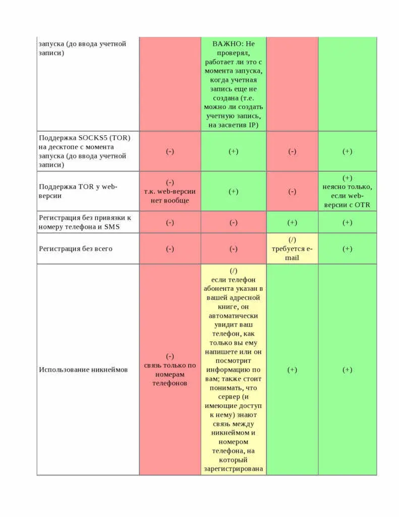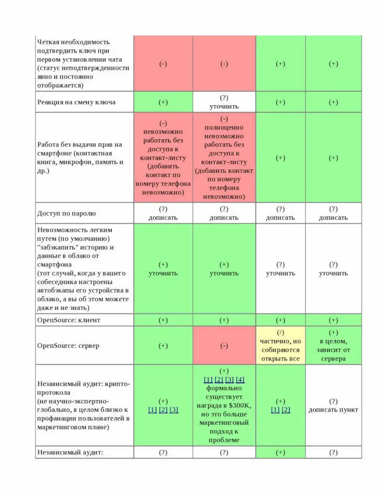 Это первая версия, данные могут быть неточны, далеко не все параметры для сравнения указаны/выбраны. Рассматриваются сугубо функции вокруг крипто-протоколов, т.к. сами протоколы (и используемые алгоритмы шифрования) можно считать в определенной степени надежными (хотя в криптографии с математической точки зрения принята совсем обратная история: пока не доказана надежность - не надежно). Акцент сделан именно на возможности с достаточным уровнем анонимности и безопасности использовать мессенджеры различными людьми (даже не понимающими в IT) в работе (т.е., например, вы хорошо понимаете в безопасности и компьютерах, а человек - совсем нет, но вам нужно обеспечить надежны и безопасный канал связи с ним).