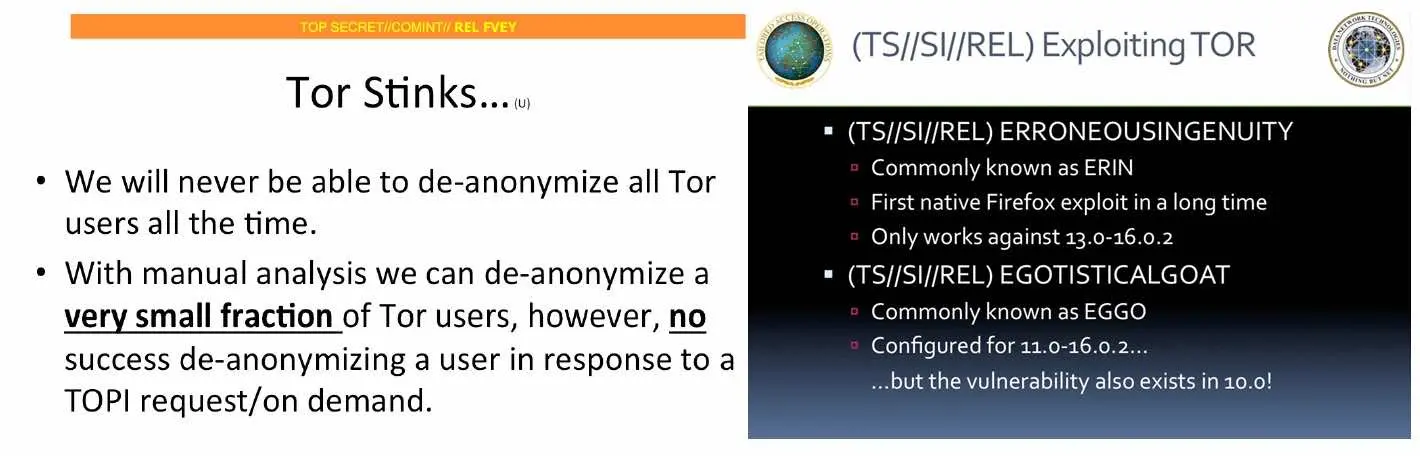Из утекших документов NSA можно также убедиться в том, что спецслужбы не брезгуют и эксплойтами к браузеру Firefox, на базе которого построен Tor Browser. Однако использование средств эксплуатации уязвимостей, как пишут в своей же презентации NSA, не позволяет вести постоянную слежку за обитателями даркнета, так как жизненный цикл эксплойтов очень короткий и версионность браузеров ставит под удар очень узкий круг пользователей.