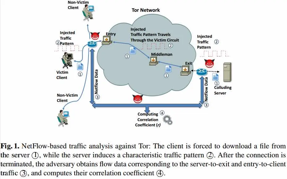 Среди множества теоретических изысканий стоит выделить фундаментальную работу, основанную на анализе трафика с использованием протокола NetFlow. Авторы исследования полагают, что у атакующей стороны есть возможность анализировать NetFlow-записи на маршрутизаторах, которые непосредственно являются узлами Tor или находятся недалеко от них. NetFlow-запись содержит следующую информацию и практически деанонимизирует клиента: